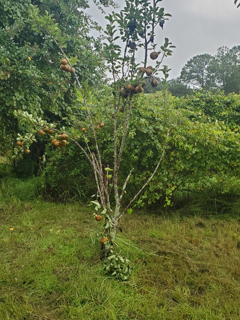 Years ago we planted pear trees on the farm and shortly after planting we had a hard freeze so our beautiful once grafted pear trees became beautiful wild Bradford pair trees. A great tiny fruit treat for the deer and other wildlife but not so much for us. The fruit of a wild pear is very small, hard and quite sour. Never the less over the last few years we were able to share in the enjoyment of the bountiful harvest of the lone pear tree that resides at the church camp and it has provided us with several jars of canned pears and pear sauce. This year though, two of the frost bitten pear trees made a come back. ( I know how can that be right?) Not really sure of what happened but these pics show you just one of the many branches that were completely weighted with fruit. And the church camp tree also held an over abundance as well.